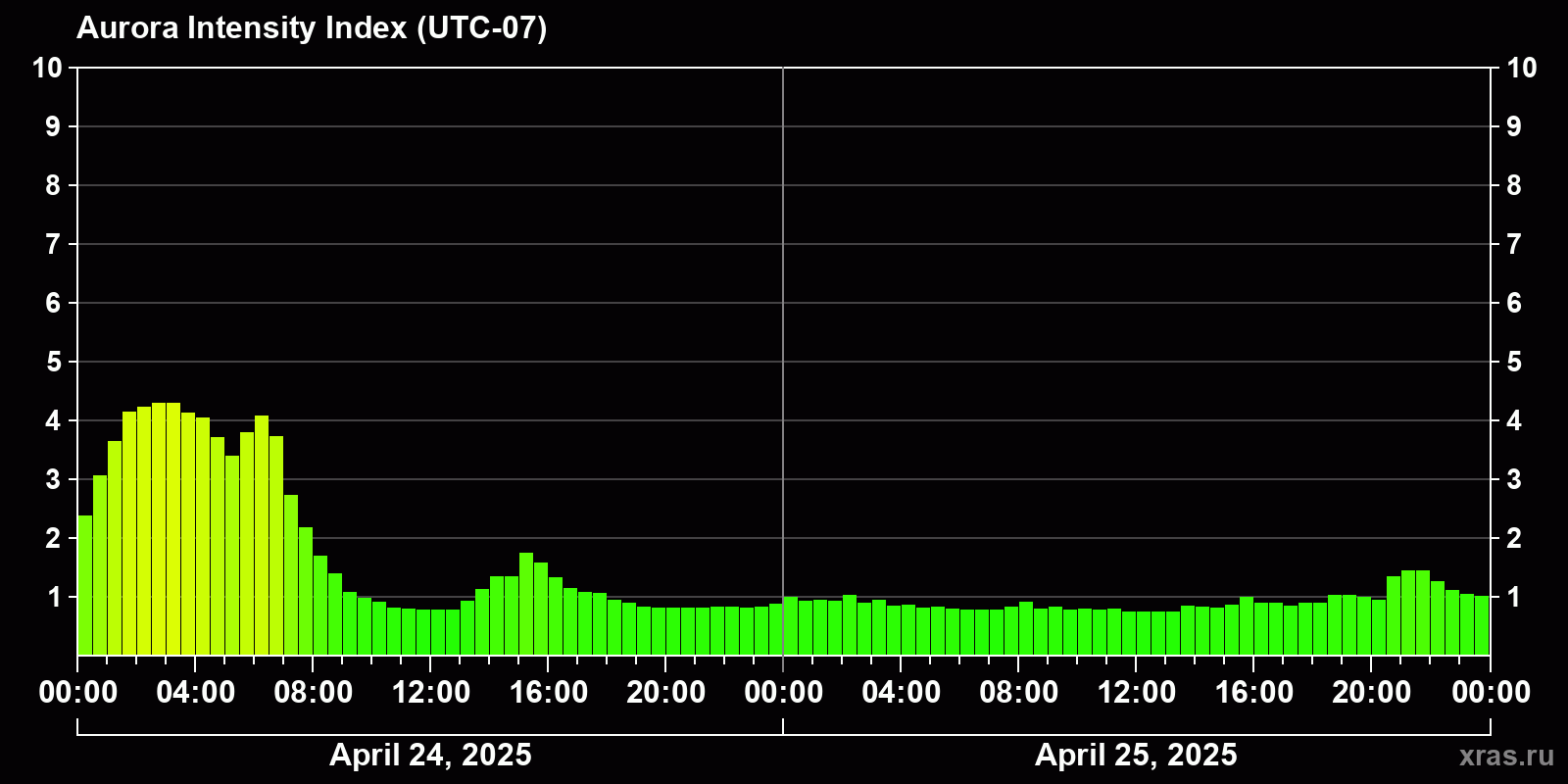 Auroral intensity index and the theoretically possible latitude of observations for nighttime in the Western Hemisphere as of 2025-04-25 23:46 (end of day) local time