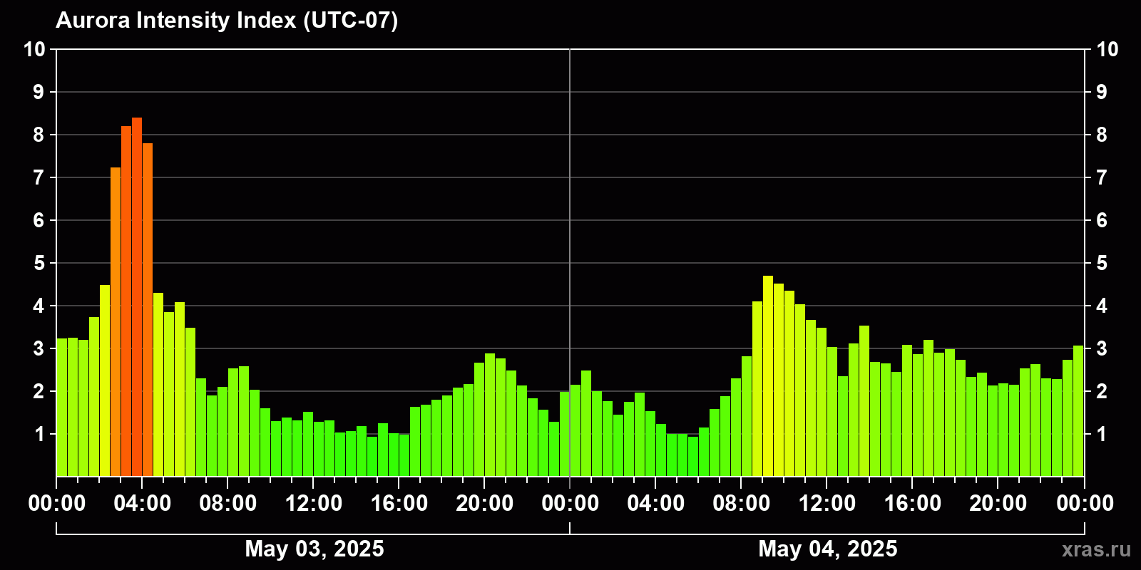 Changes in the auroral intensity index from 2025-05-03 to 2025-05-04 local time