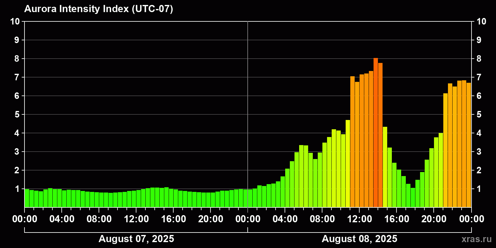 Changes in the auroral intensity index from 2025-08-07 to 2025-08-08 local time