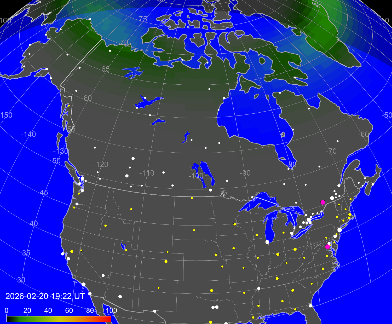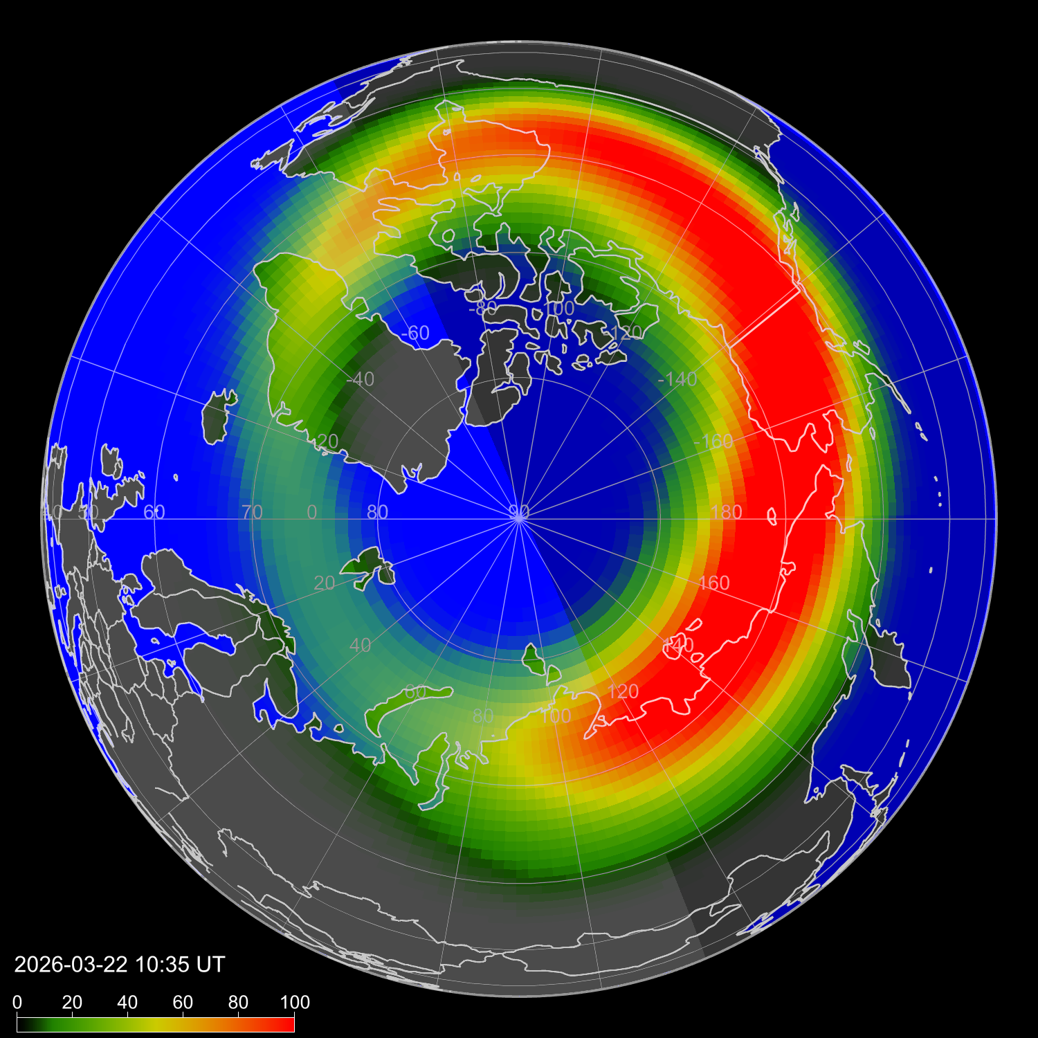Индекс интенсивности полярных сияний и теоретически возможная широта наблюдений для ночного времени в западном полушарии