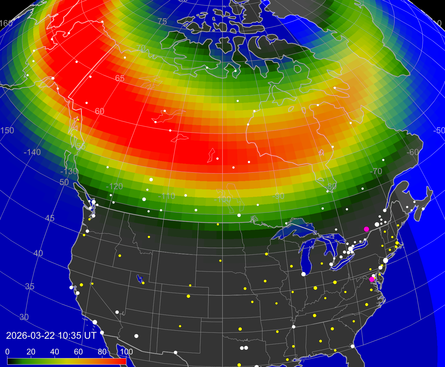 Изменения и часовой прогноз индекса интенсивности полярных сияний с 2026-03-20 по 2026-03-21