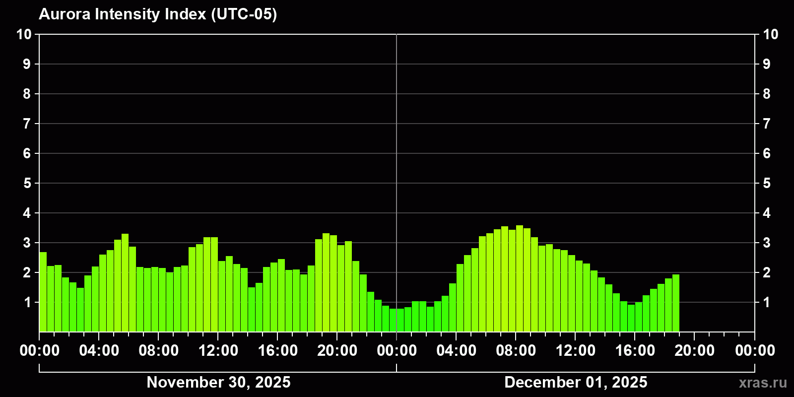 Auroral intensity index and the theoretically possible latitude of observations for nighttime in the Western Hemisphere as of 2025-12-01 13:40 (end of day) local time