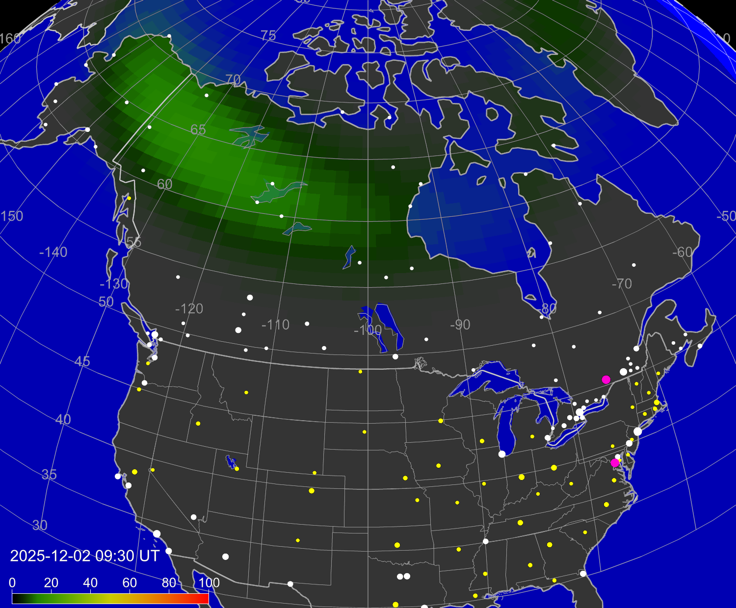 Изменения и часовой прогноз индекса интенсивности полярных сияний с 2025-11-30 по 2025-12-01