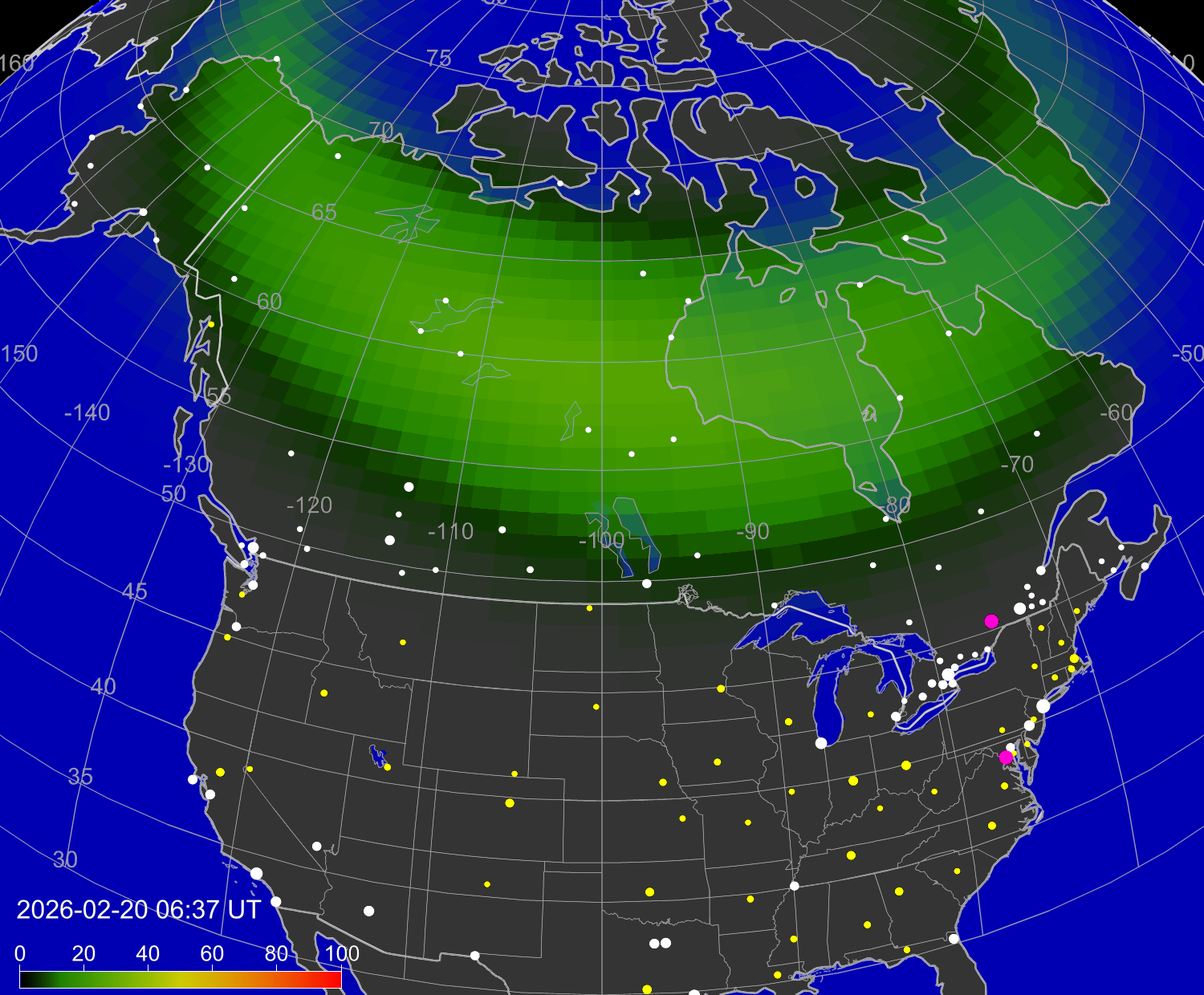 Зона полярных (северных) сияний над территорией Северной Америки