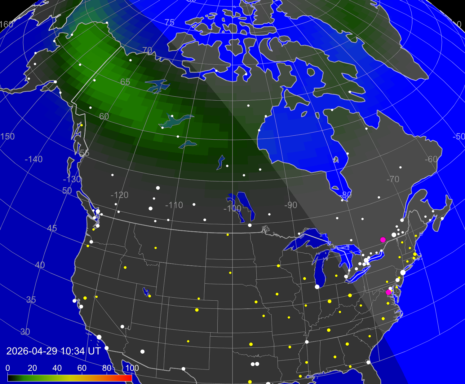 Auroral intensity index and theoretically possible latitude of observations for nighttime in the Western Hemisphere