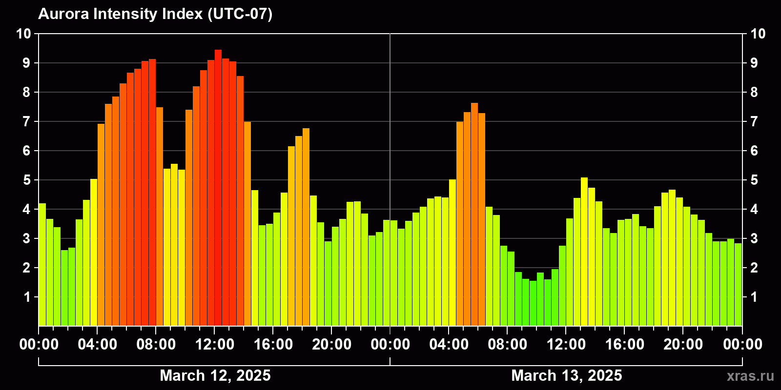 Changes in the auroral intensity index from 2025-03-12 to 2025-03-13 local time