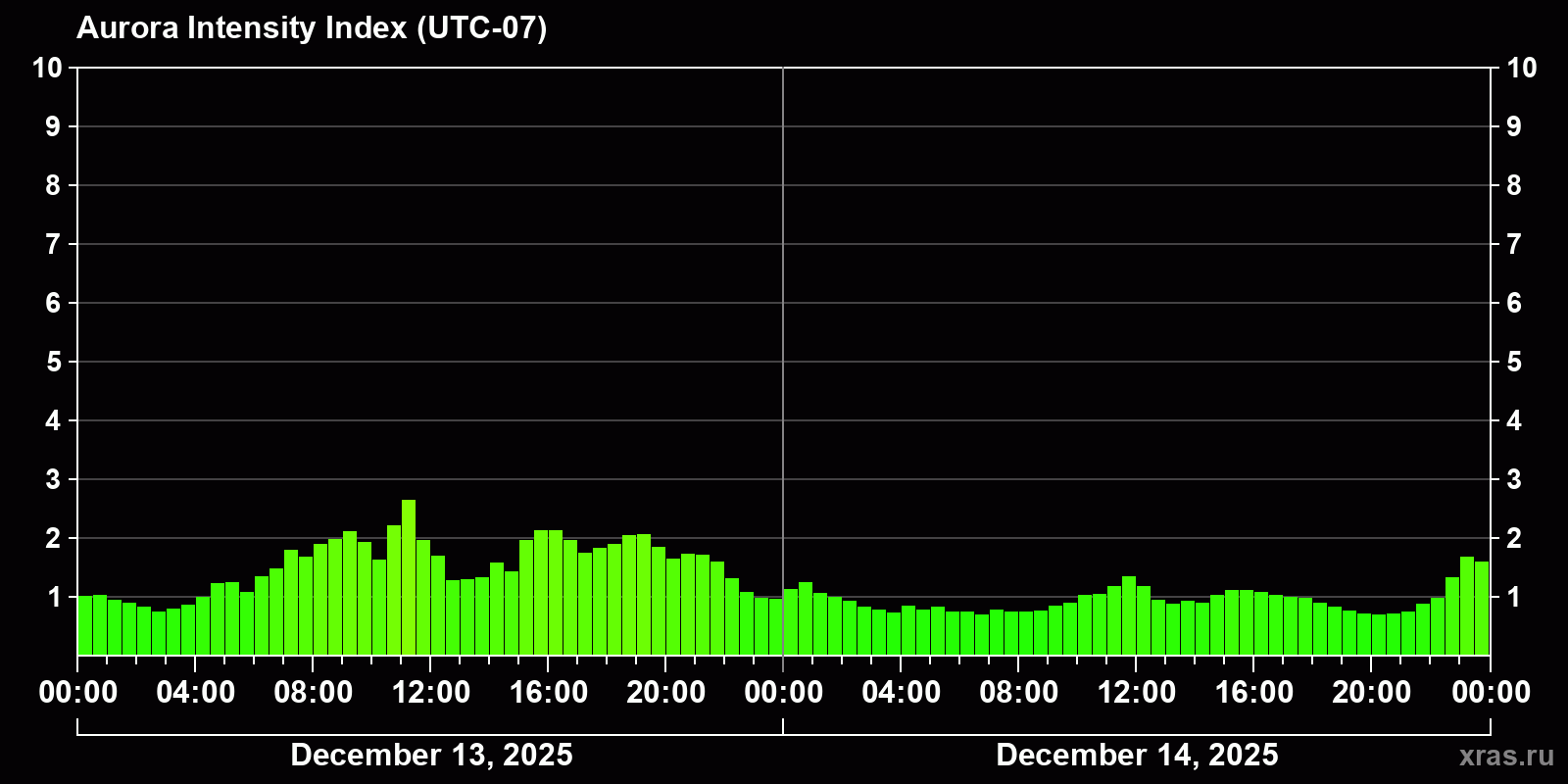 Auroral intensity index and the theoretically possible latitude of observations for nighttime in the Western Hemisphere as of 2025-12-14 23:45 (end of day) local time