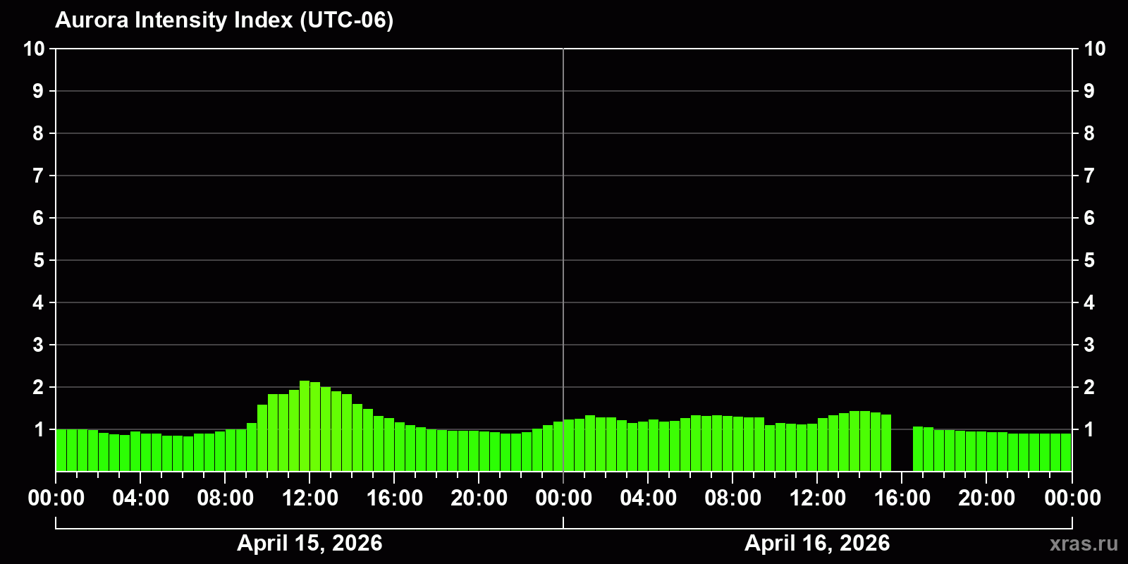 Changes in the auroral intensity index from 2026-04-15 to 2026-04-16 local time