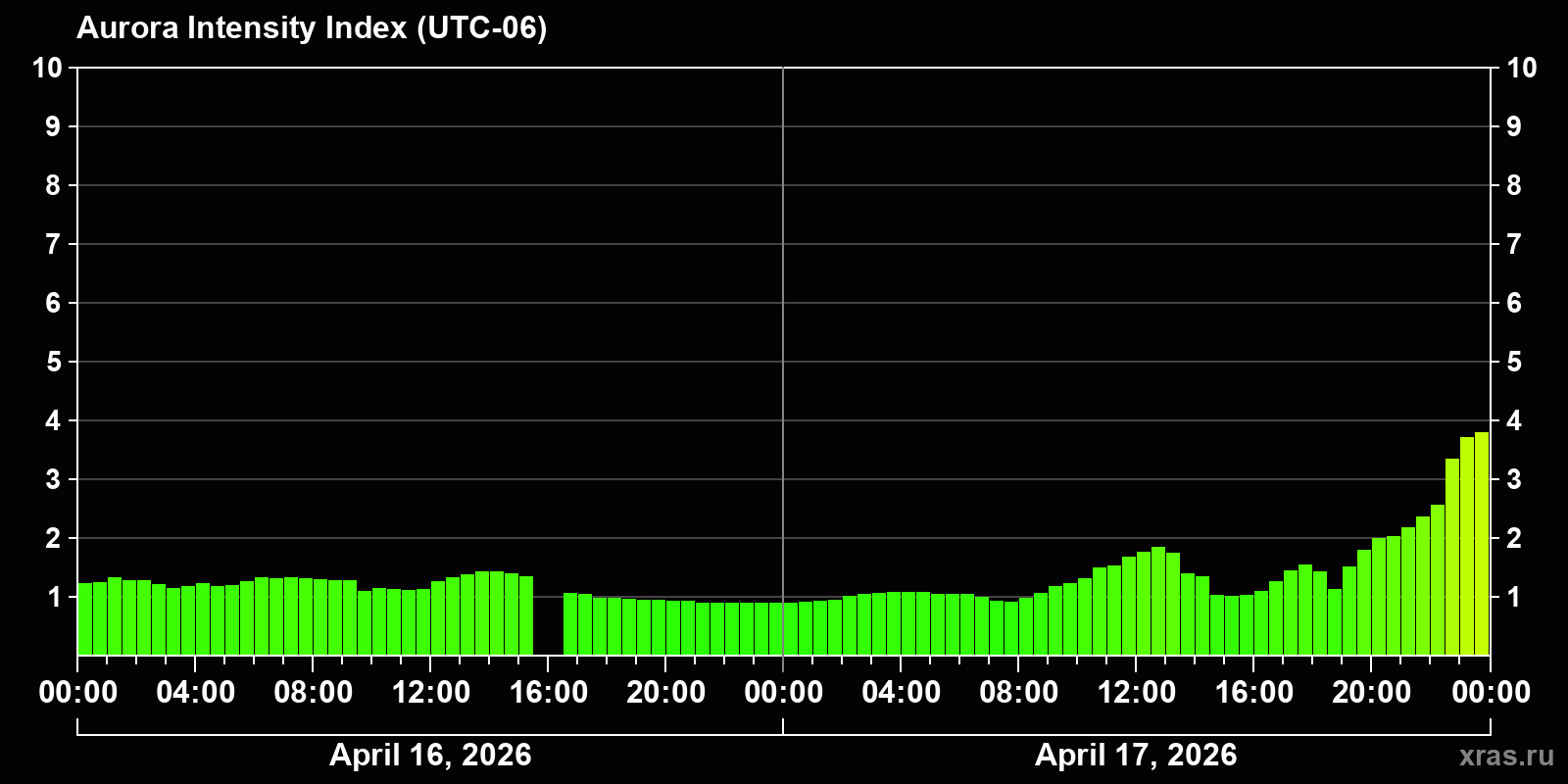 Changes in the auroral intensity index from 2026-04-16 to 2026-04-17 local time