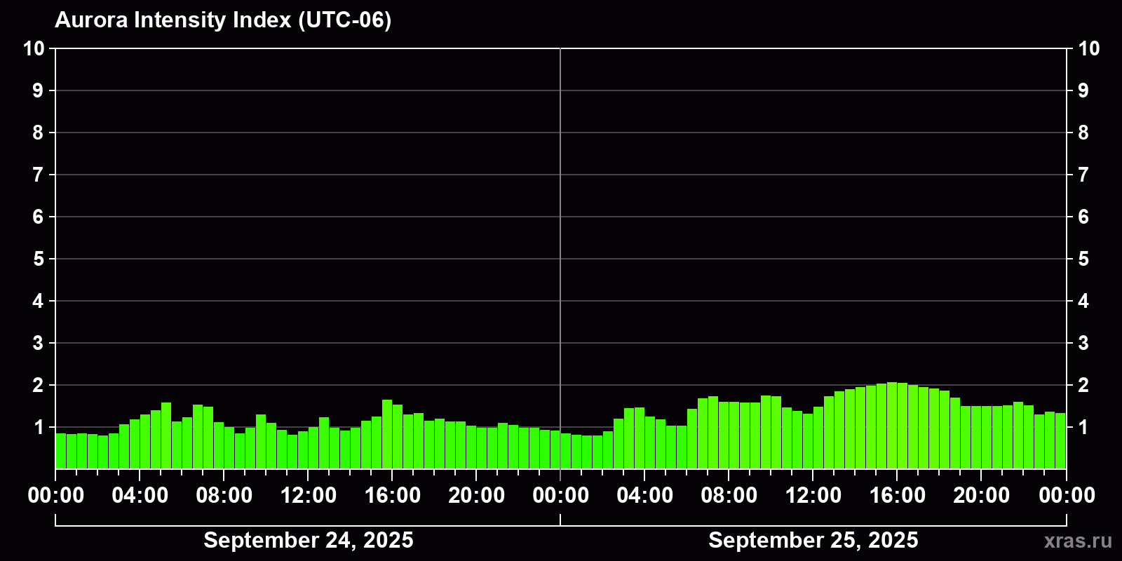 Changes in the auroral intensity index from 2025-09-24 to 2025-09-25 local time