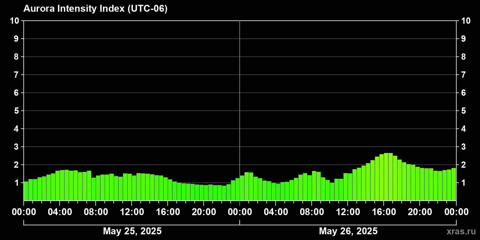 Changes in the auroral intensity index from 2025-05-25 to 2025-05-26 local time