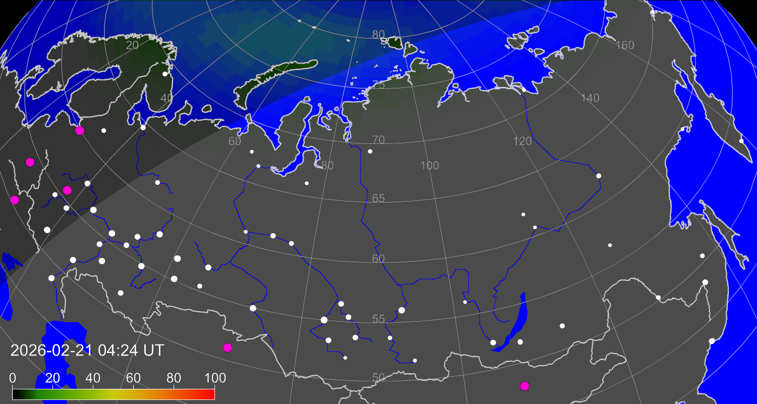 Индекс интенсивности полярных сияний и теоретически возможная широта наблюдений для ночного времени в восточном полушарии