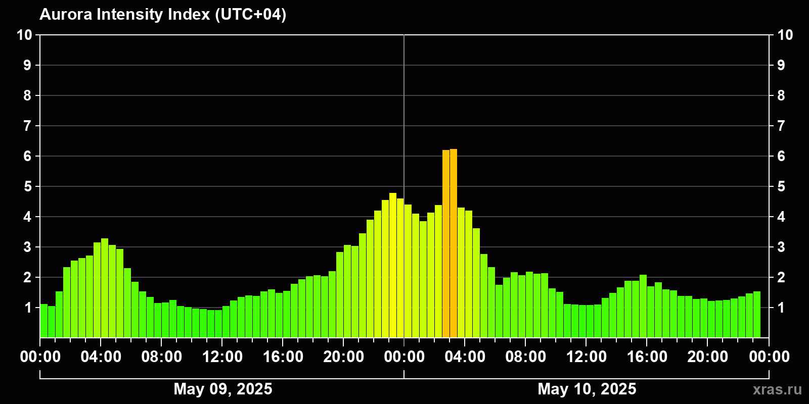 Auroral intensity index and the theoretically possible latitude of observations for nighttime in the Estern Hemisphere as of 2025-05-10 23:11 (end of day) local time