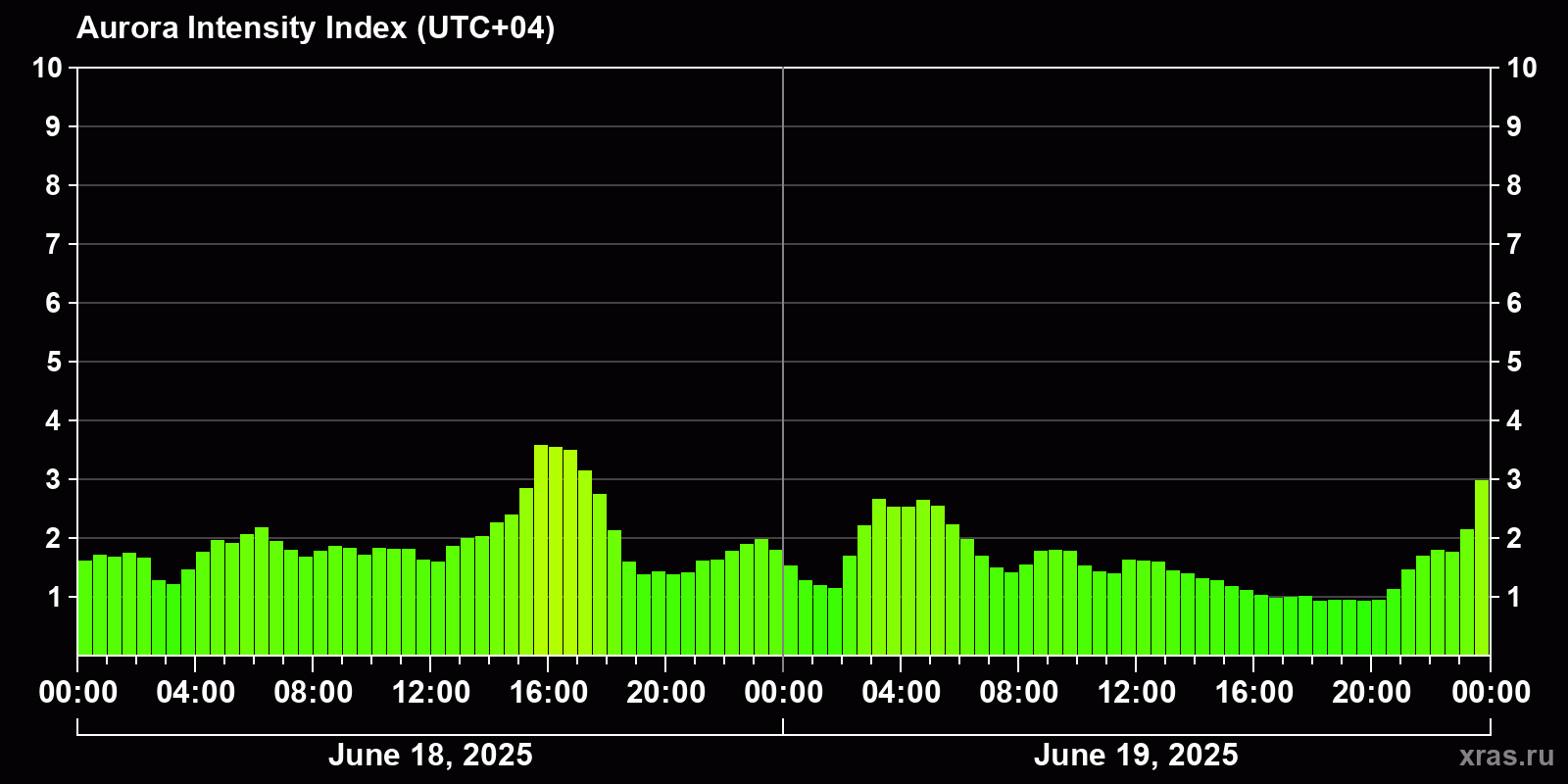 Auroral intensity index and the theoretically possible latitude of observations for nighttime in the Estern Hemisphere as of 2025-06-19 23:46 (end of day) local time