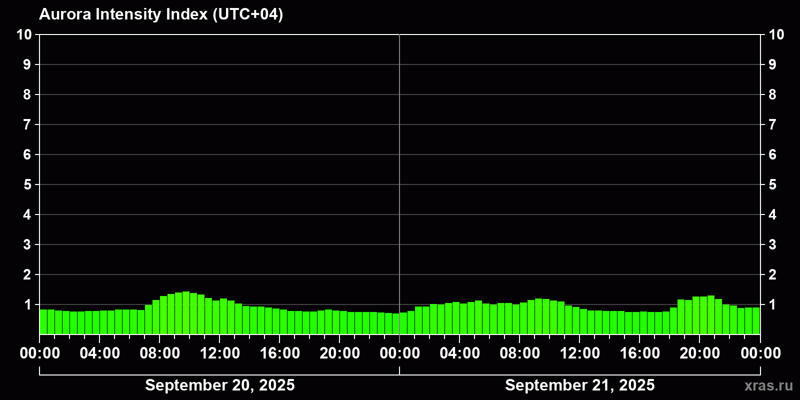Auroral intensity index and the theoretically possible latitude of observations for nighttime in the Estern Hemisphere as of 2025-09-21 23:45 (end of day) local time