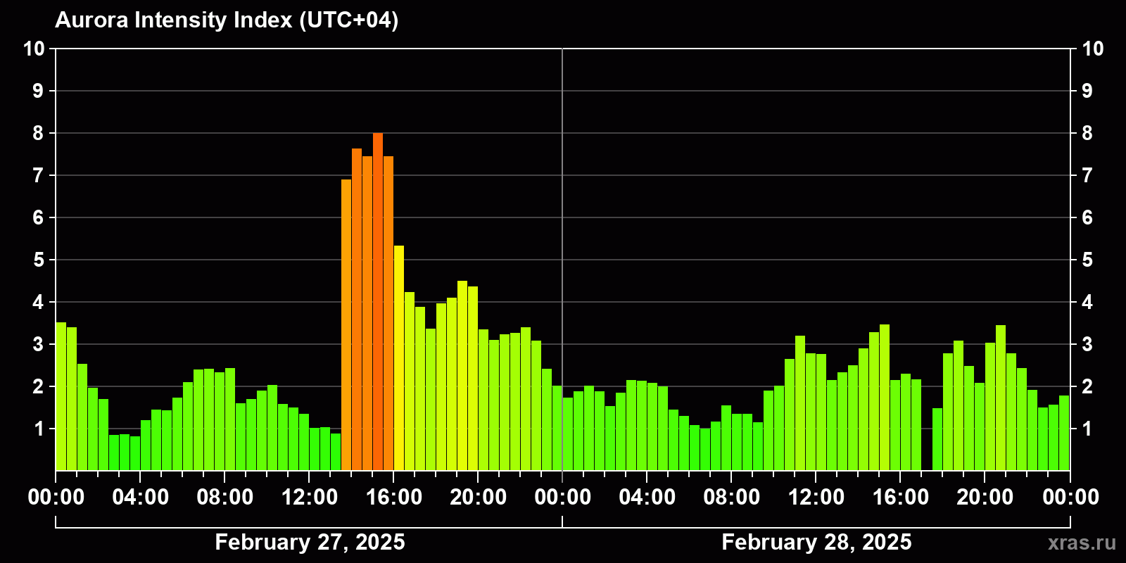 Auroral intensity index and the theoretically possible latitude of observations for nighttime in the Estern Hemisphere as of 2025-02-28 23:45 (end of day) local time