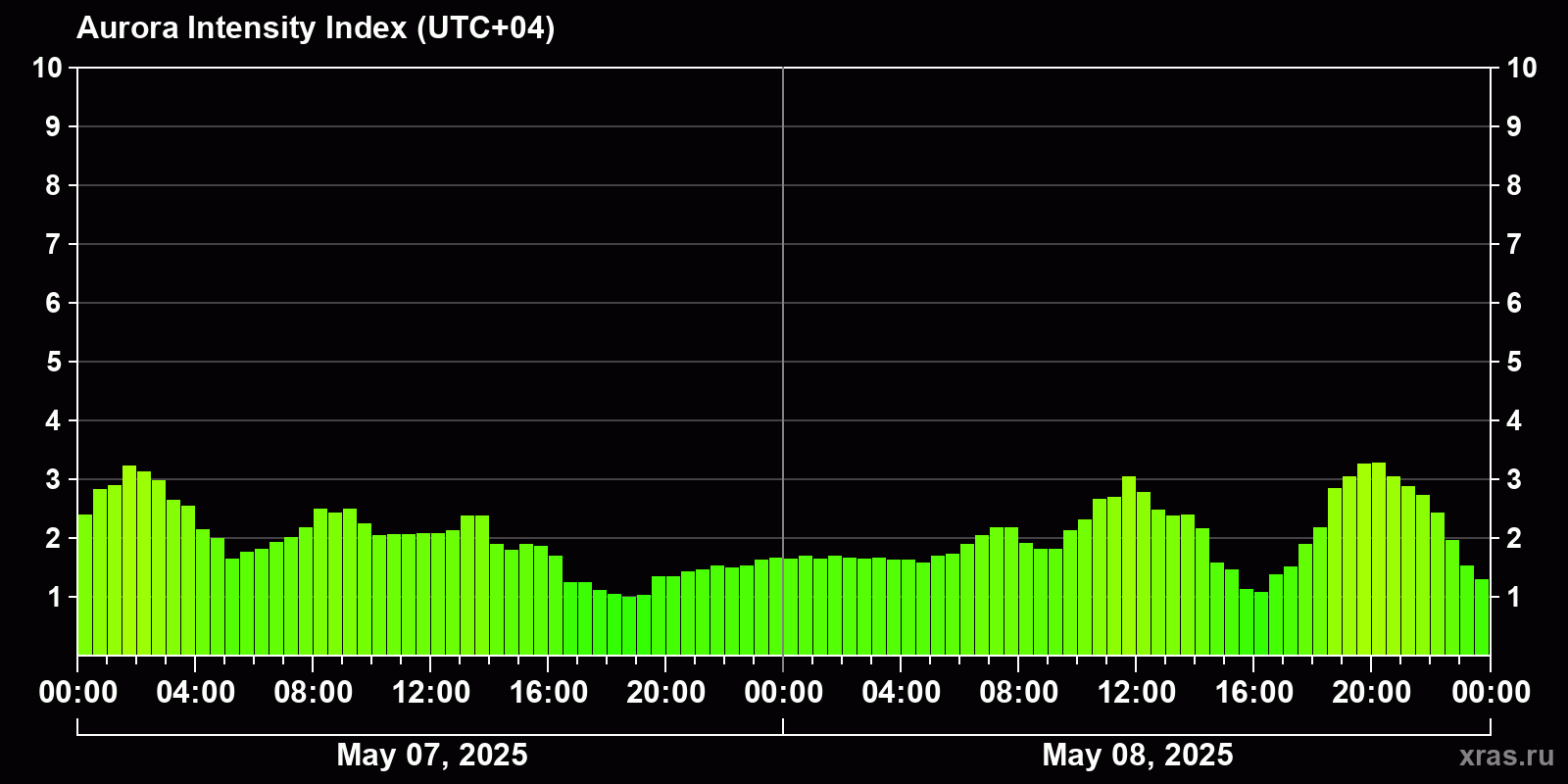 Auroral intensity index and the theoretically possible latitude of observations for nighttime in the Estern Hemisphere as of 2025-05-08 23:57 (end of day) local time