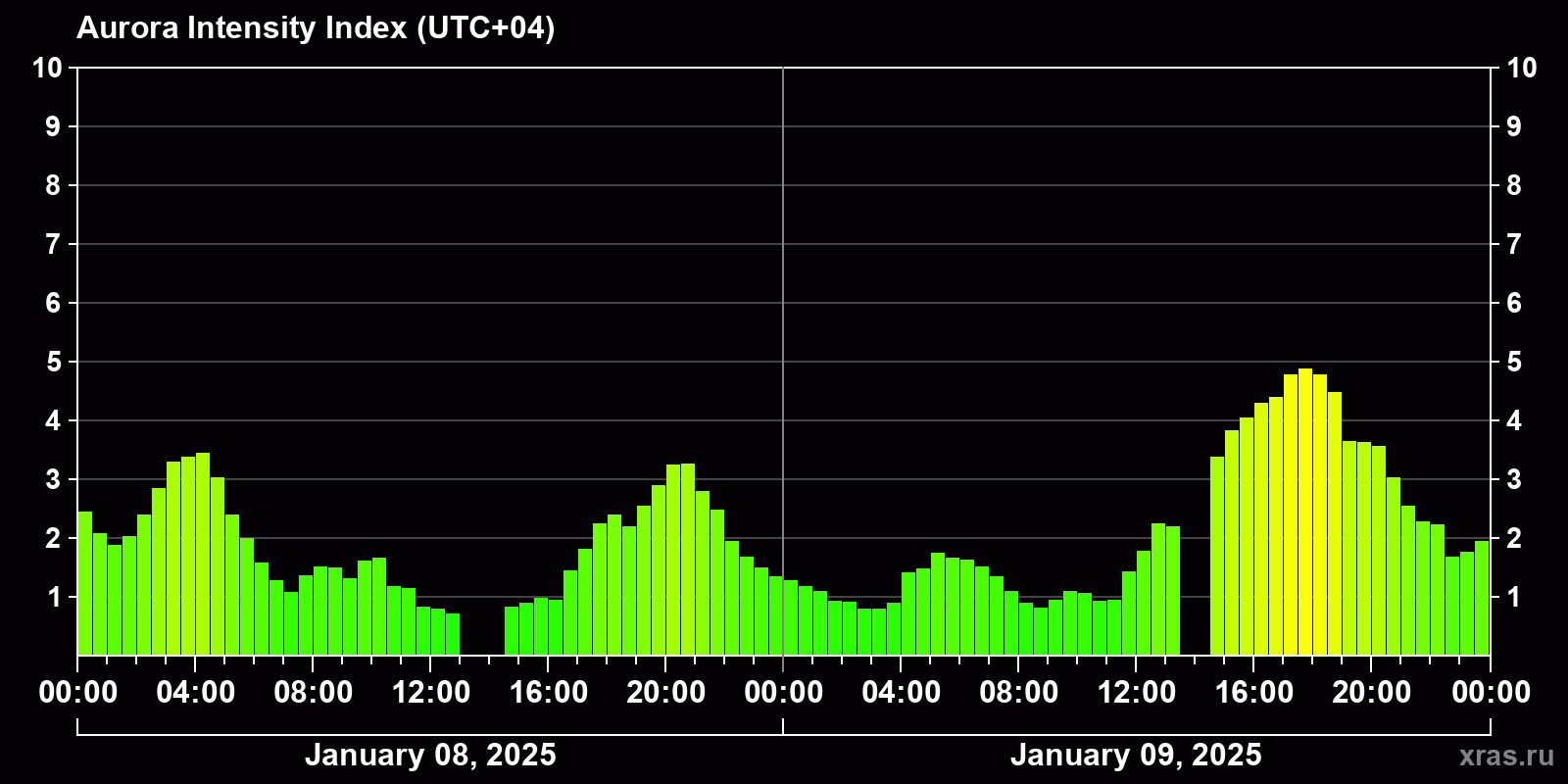 Auroral intensity index and the theoretically possible latitude of observations for nighttime in the Estern Hemisphere as of 2025-01-09 23:58 (end of day) local time