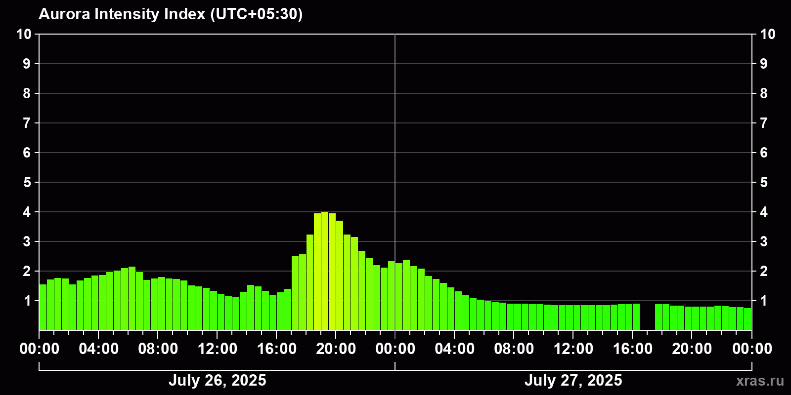 Changes in the auroral intensity index from 2025-07-26 to 2025-07-27 local time