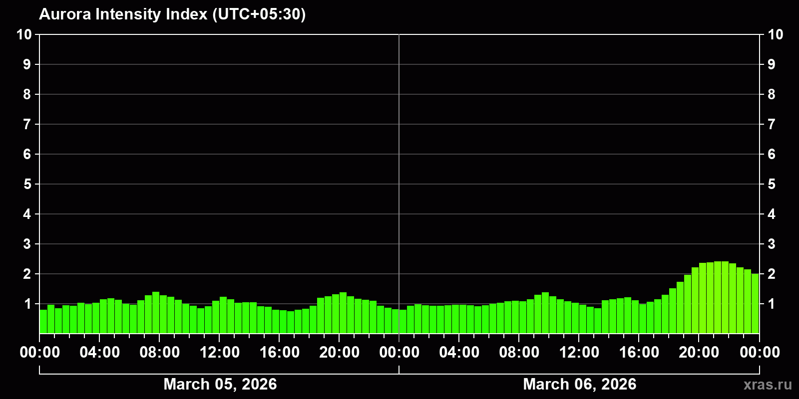 Changes in the auroral intensity index from 2026-03-05 to 2026-03-06 local time