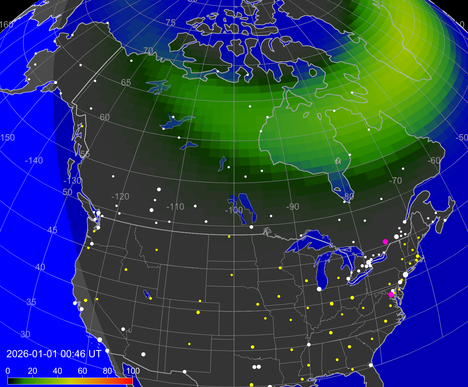 Вероятность полярных сияний в городах США
