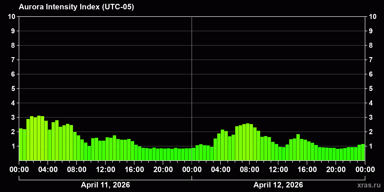Auroral intensity index and the theoretically possible latitude of observations for nighttime in the Western Hemisphere as of 2026-04-12 23:48 (end of day) local time