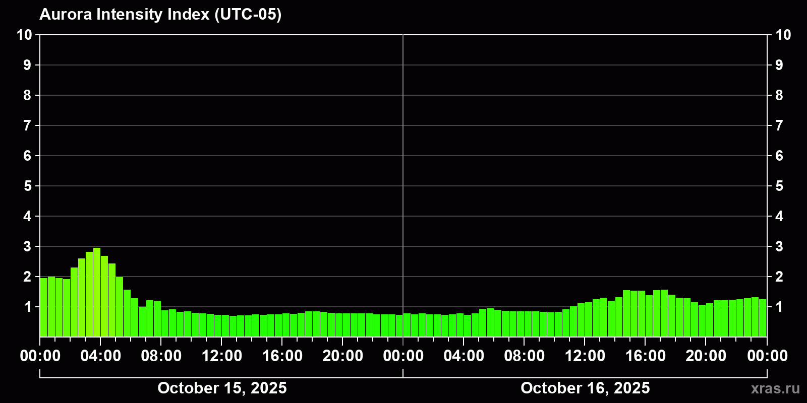 Auroral intensity index and the theoretically possible latitude of observations for nighttime in the Western Hemisphere as of 2025-10-16 23:48 (end of day) local time