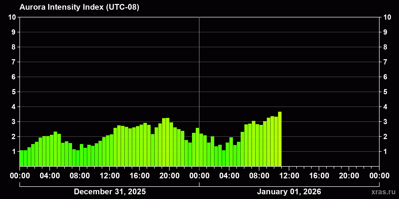 Auroral intensity index and the theoretically possible latitude of observations for nighttime in the Western Hemisphere as of 2026-01-01 08:36 (end of day) local time