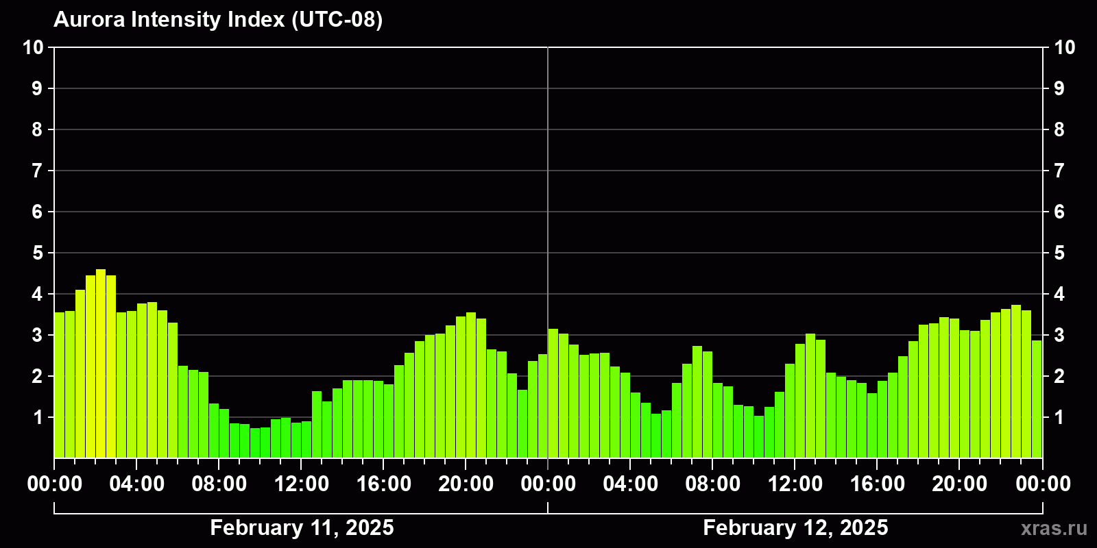 Auroral intensity index and the theoretically possible latitude of observations for nighttime in the Western Hemisphere as of 2025-02-12 23:50 (end of day) local time