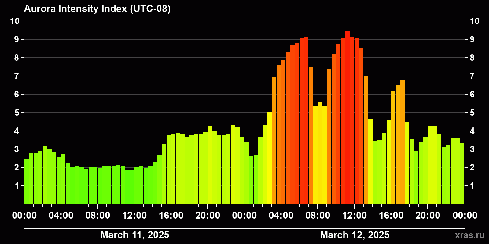 Changes in the auroral intensity index from 2025-03-11 to 2025-03-12 local time