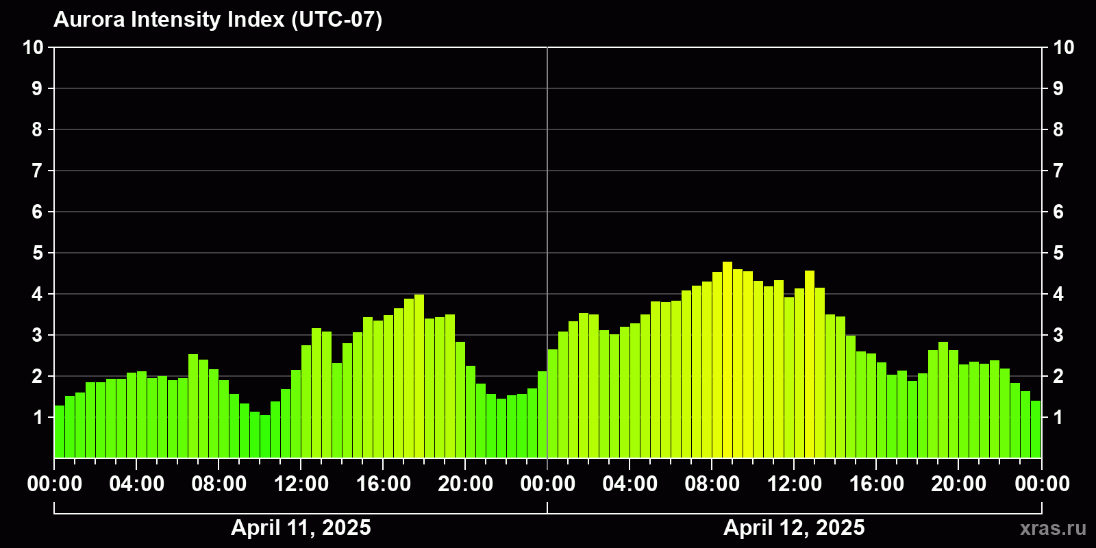 Changes in the auroral intensity index from 2025-04-11 to 2025-04-12 local time