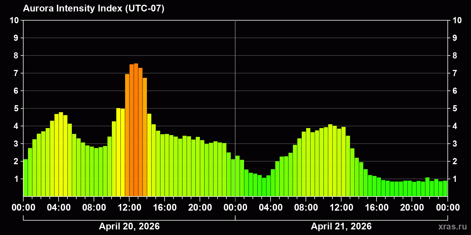 Changes in the auroral intensity index from 2026-04-20 to 2026-04-21 local time