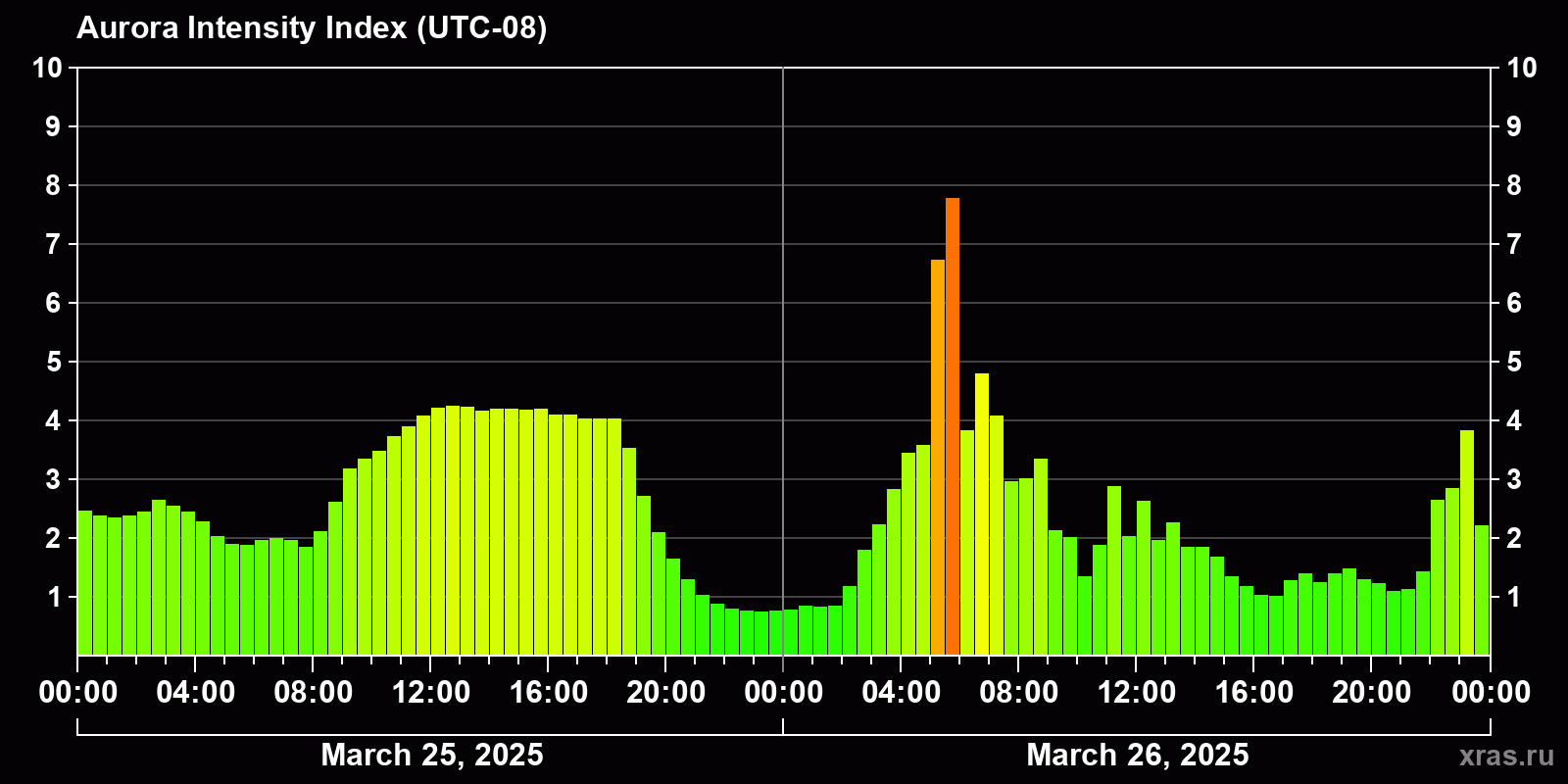 Changes in the auroral intensity index from 2025-03-25 to 2025-03-26 local time