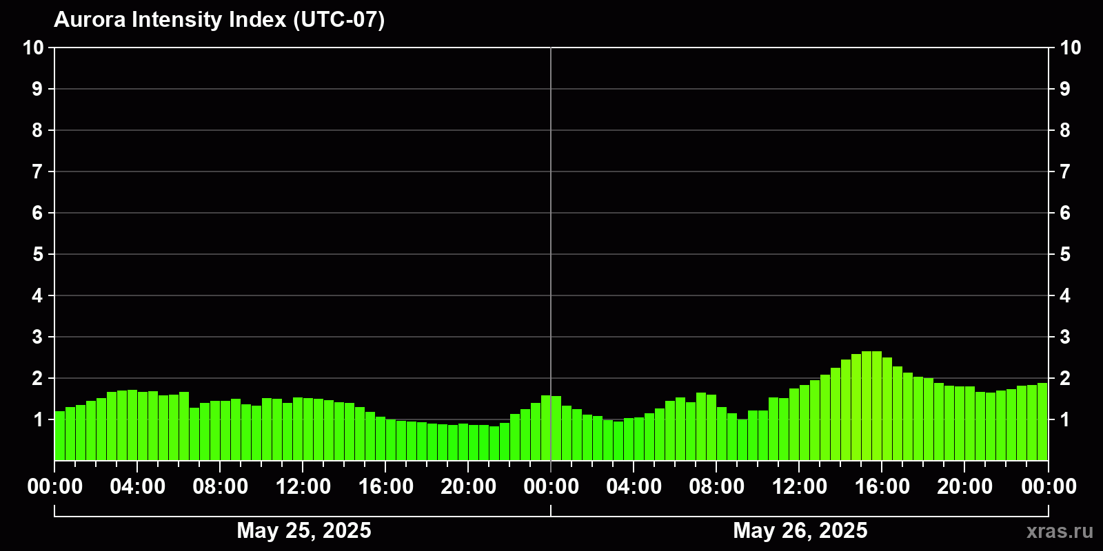 Auroral intensity index and the theoretically possible latitude of observations for nighttime in the Western Hemisphere as of 2025-05-26 23:54 (end of day) local time