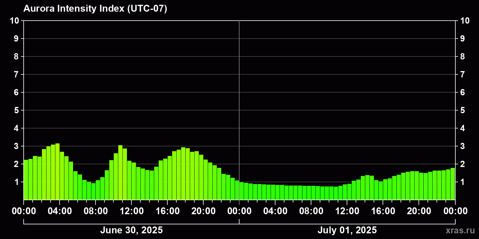 Changes in the auroral intensity index from 2025-06-30 to 2025-07-01 local time