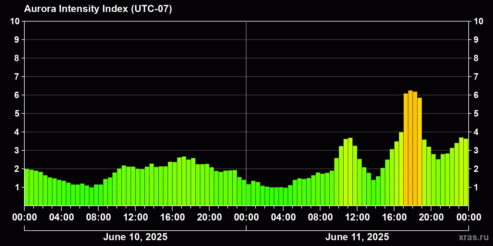 Changes in the auroral intensity index from 2025-06-10 to 2025-06-11 local time