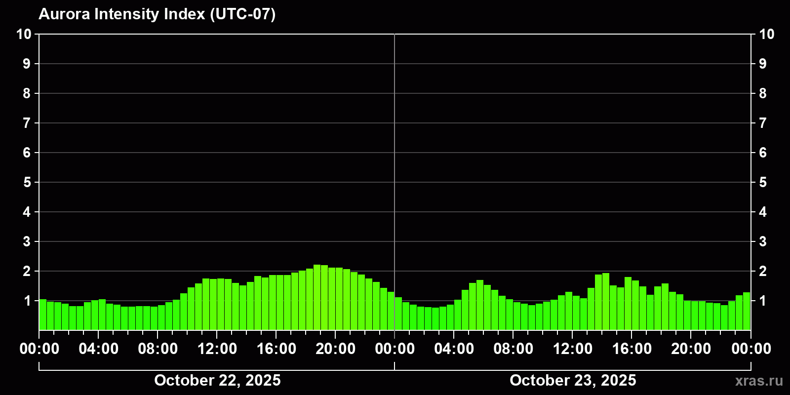 Changes in the auroral intensity index from 2025-10-22 to 2025-10-23 local time