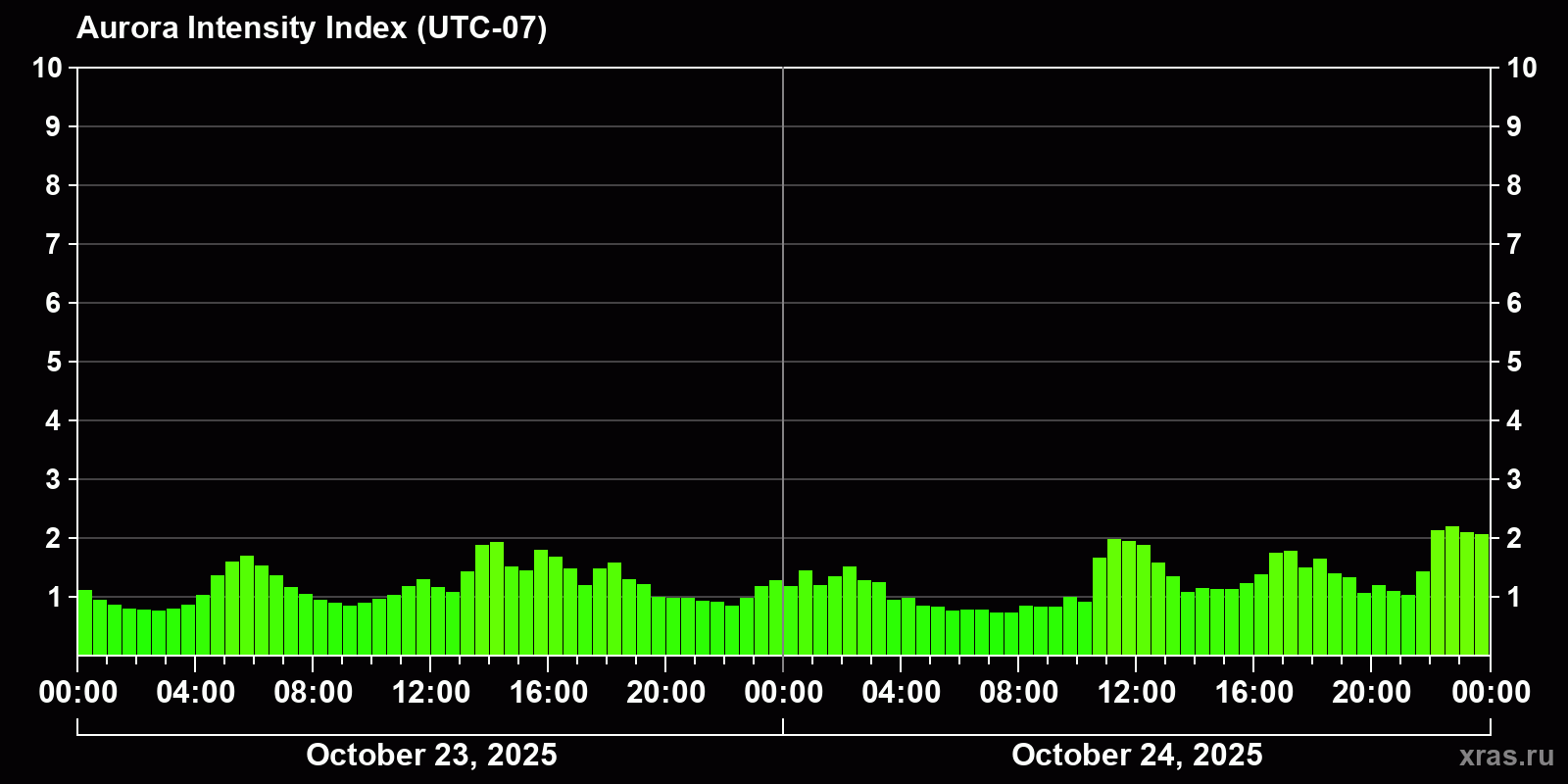 Auroral intensity index and the theoretically possible latitude of observations for nighttime in the Western Hemisphere as of 2025-10-24 23:58 (end of day) local time
