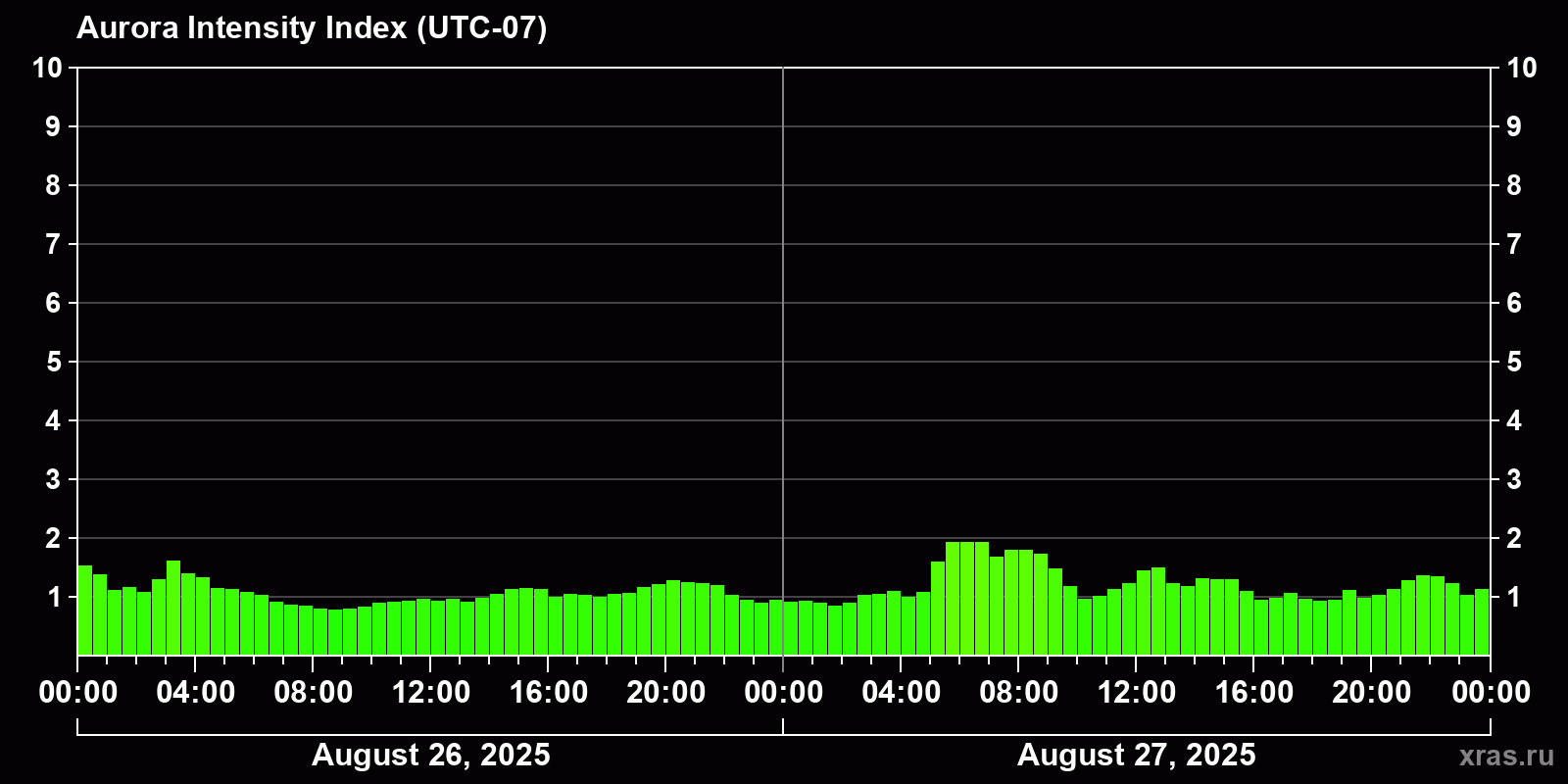 Changes in the auroral intensity index from 2025-08-26 to 2025-08-27 local time