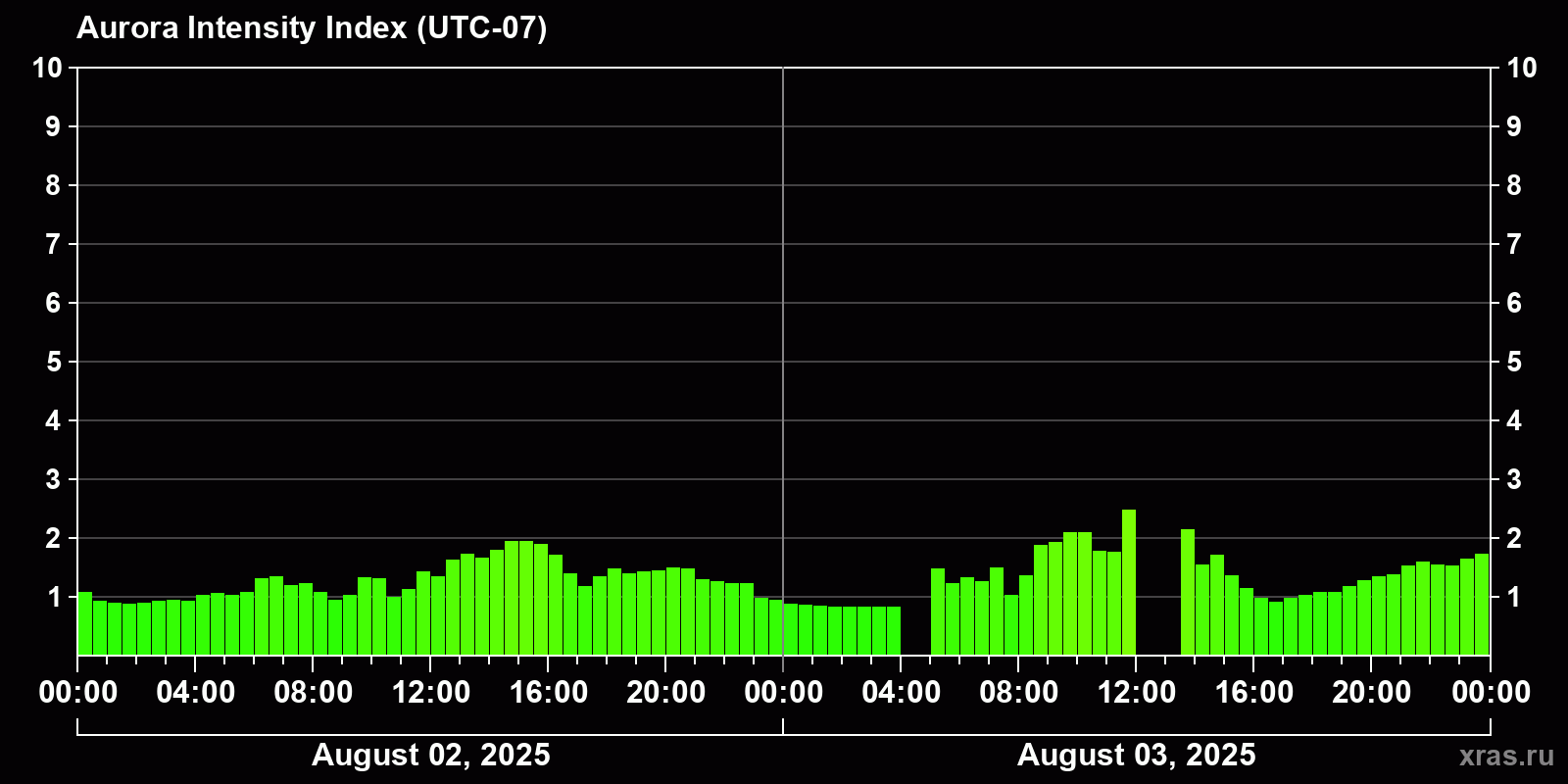 Changes in the auroral intensity index from 2025-08-02 to 2025-08-03 local time