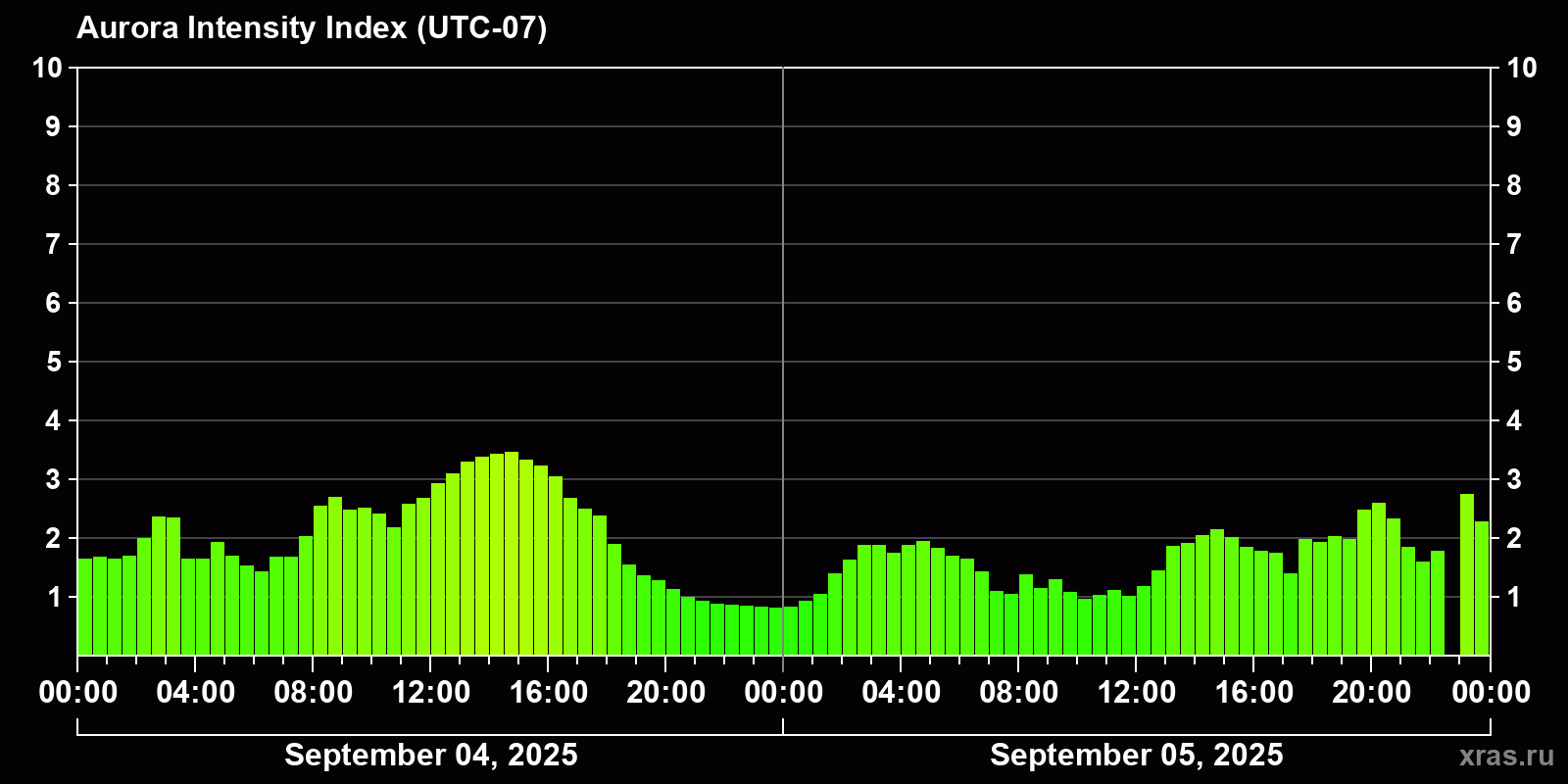 Changes in the auroral intensity index from 2025-09-04 to 2025-09-05 local time