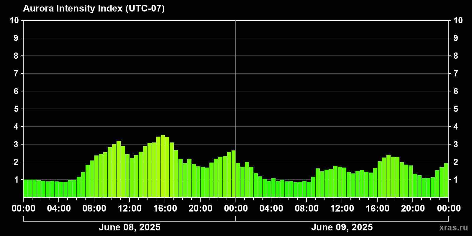 Changes in the auroral intensity index from 2025-06-08 to 2025-06-09 local time