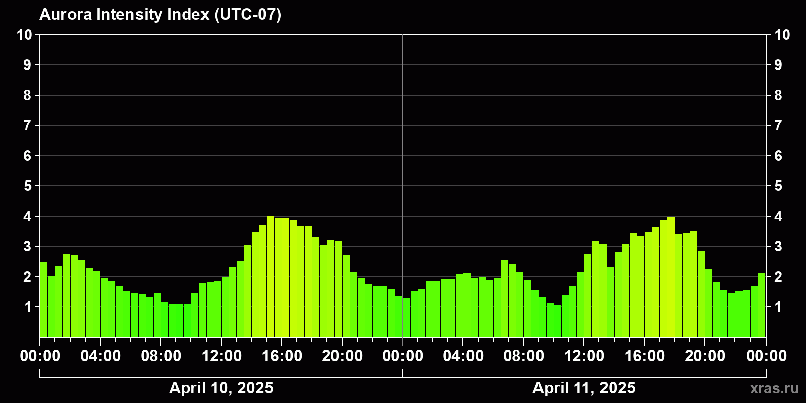 Changes in the auroral intensity index from 2025-04-10 to 2025-04-11 local time
