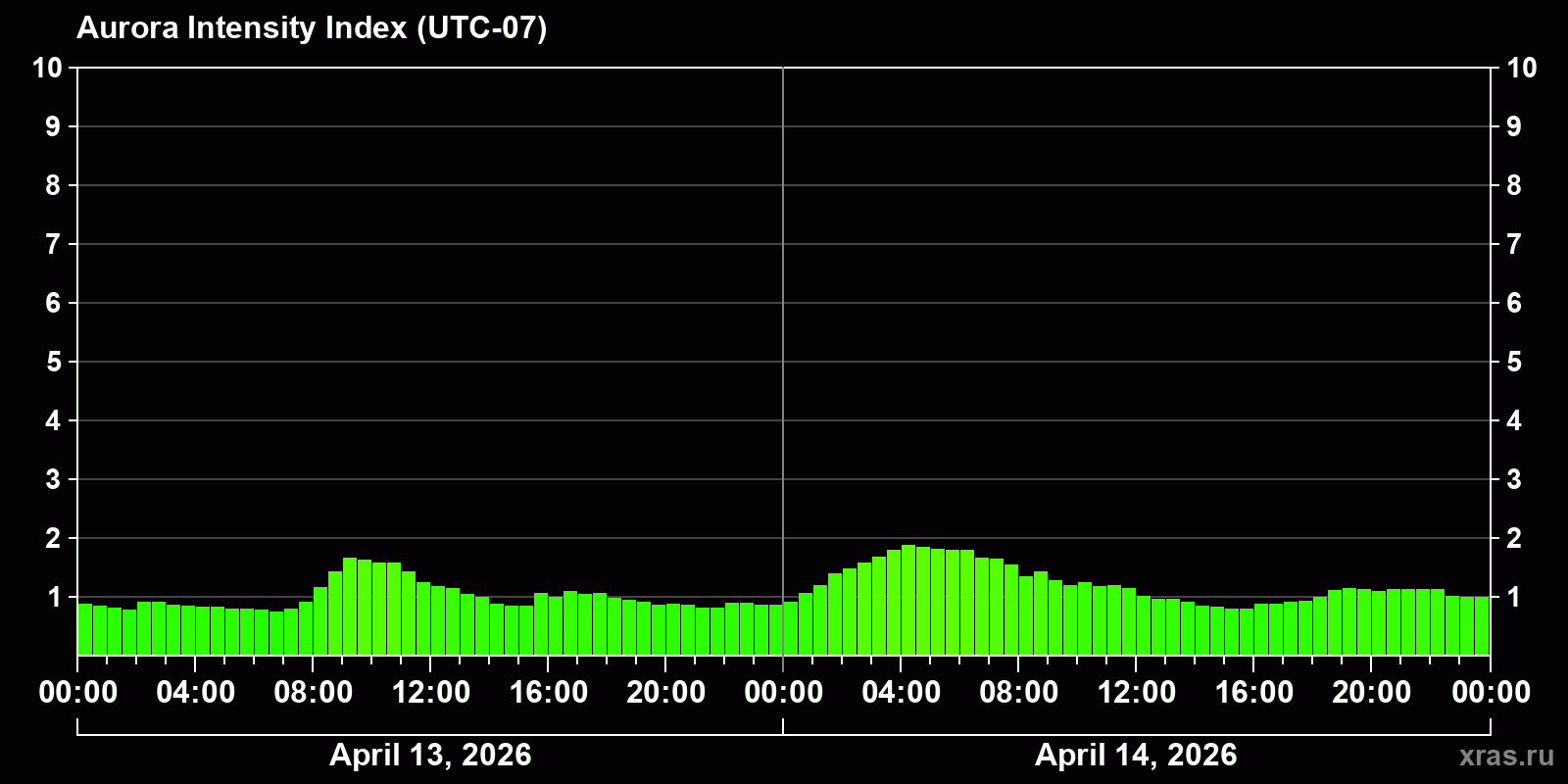 Changes in the auroral intensity index from 2026-04-13 to 2026-04-14 local time
