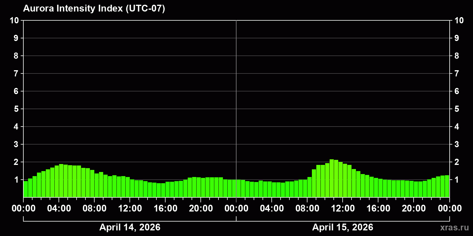 Changes in the auroral intensity index from 2026-04-14 to 2026-04-15 local time
