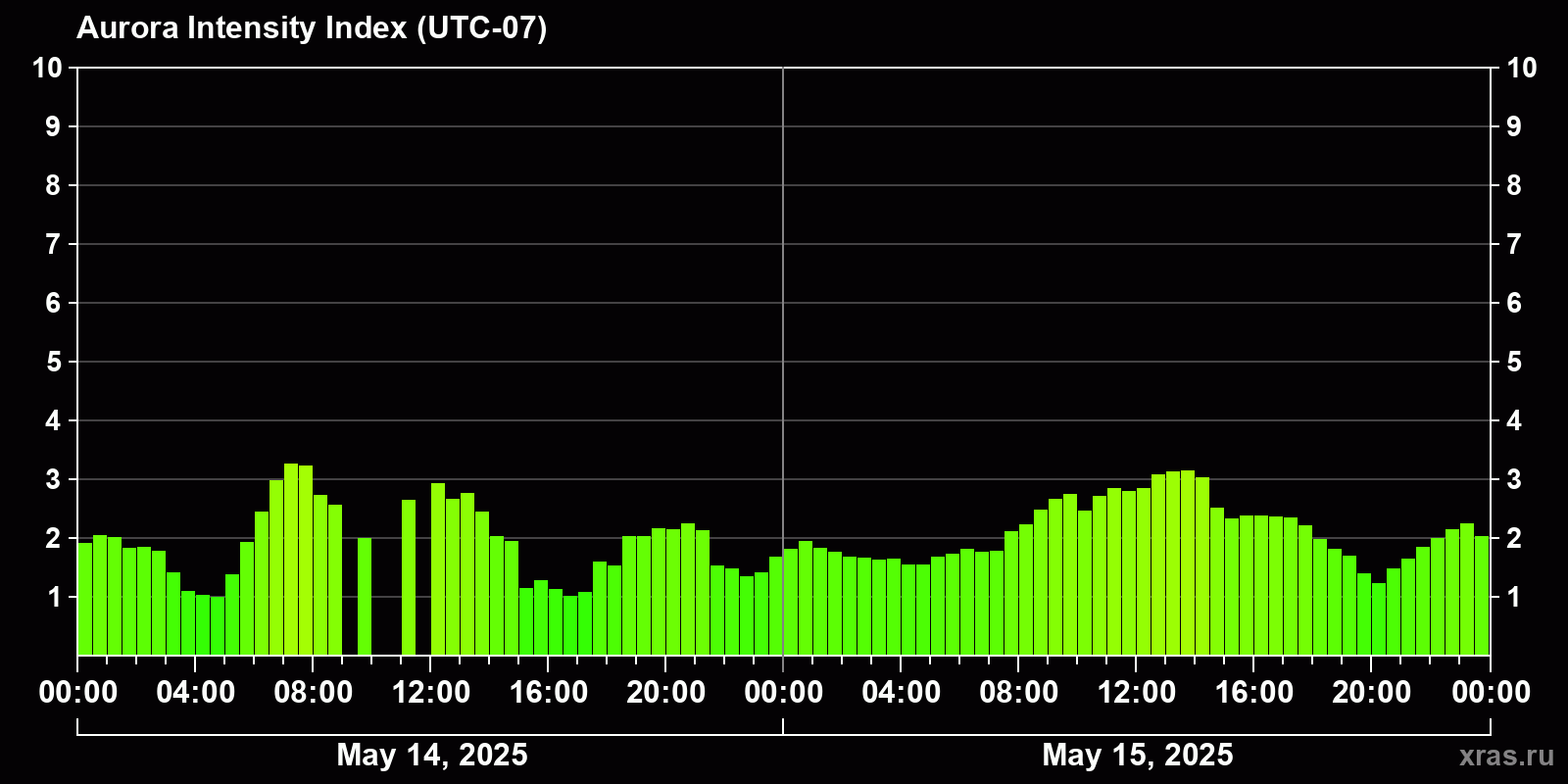 Changes in the auroral intensity index from 2025-05-14 to 2025-05-15 local time