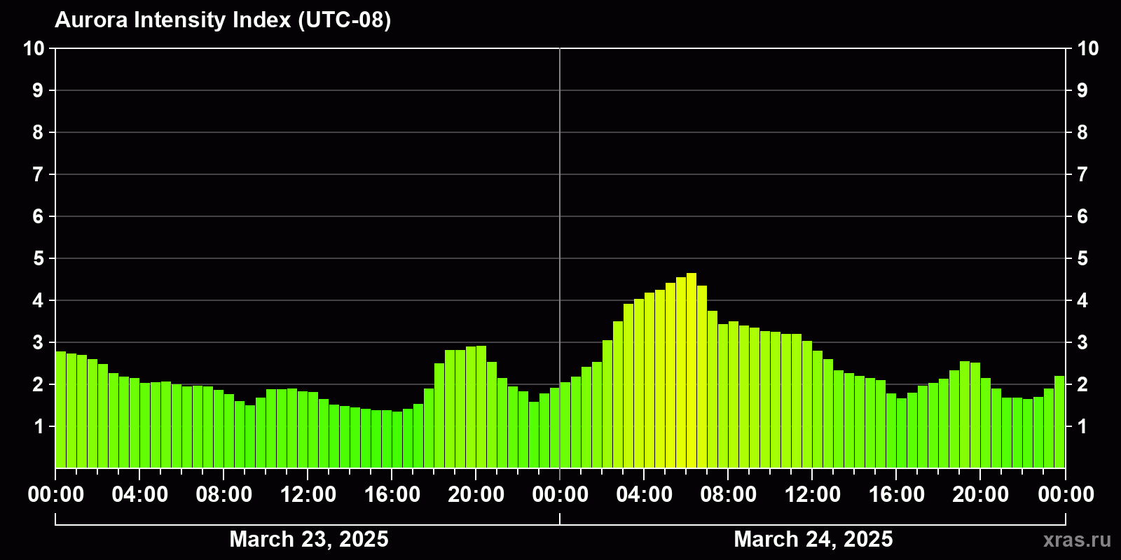 Auroral intensity index and the theoretically possible latitude of observations for nighttime in the Western Hemisphere as of 2025-03-24 23:51 (end of day) local time
