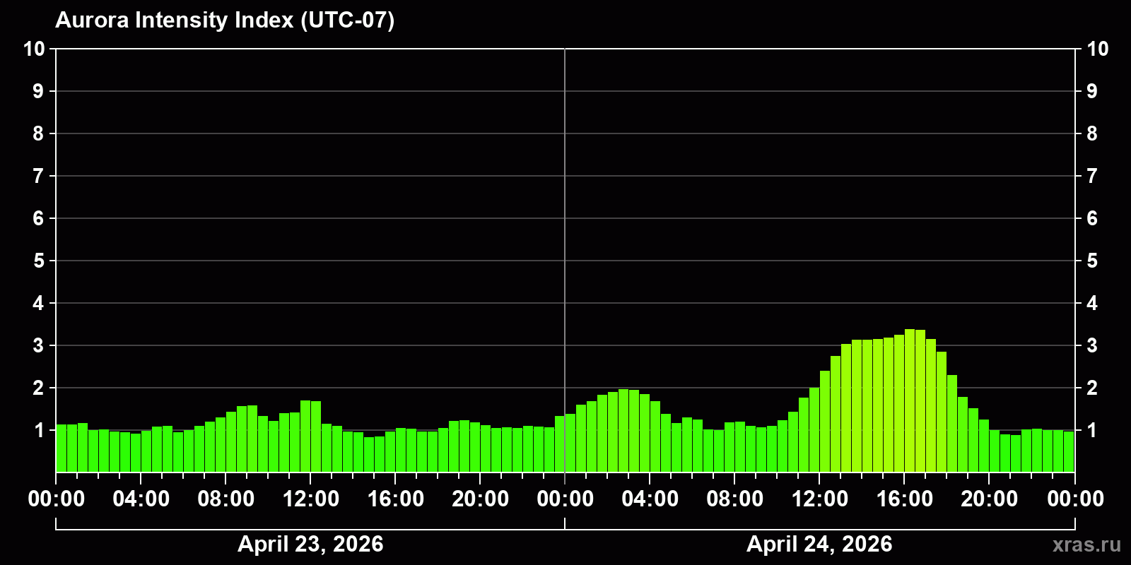 Changes in the auroral intensity index from 2026-04-23 to 2026-04-24 local time