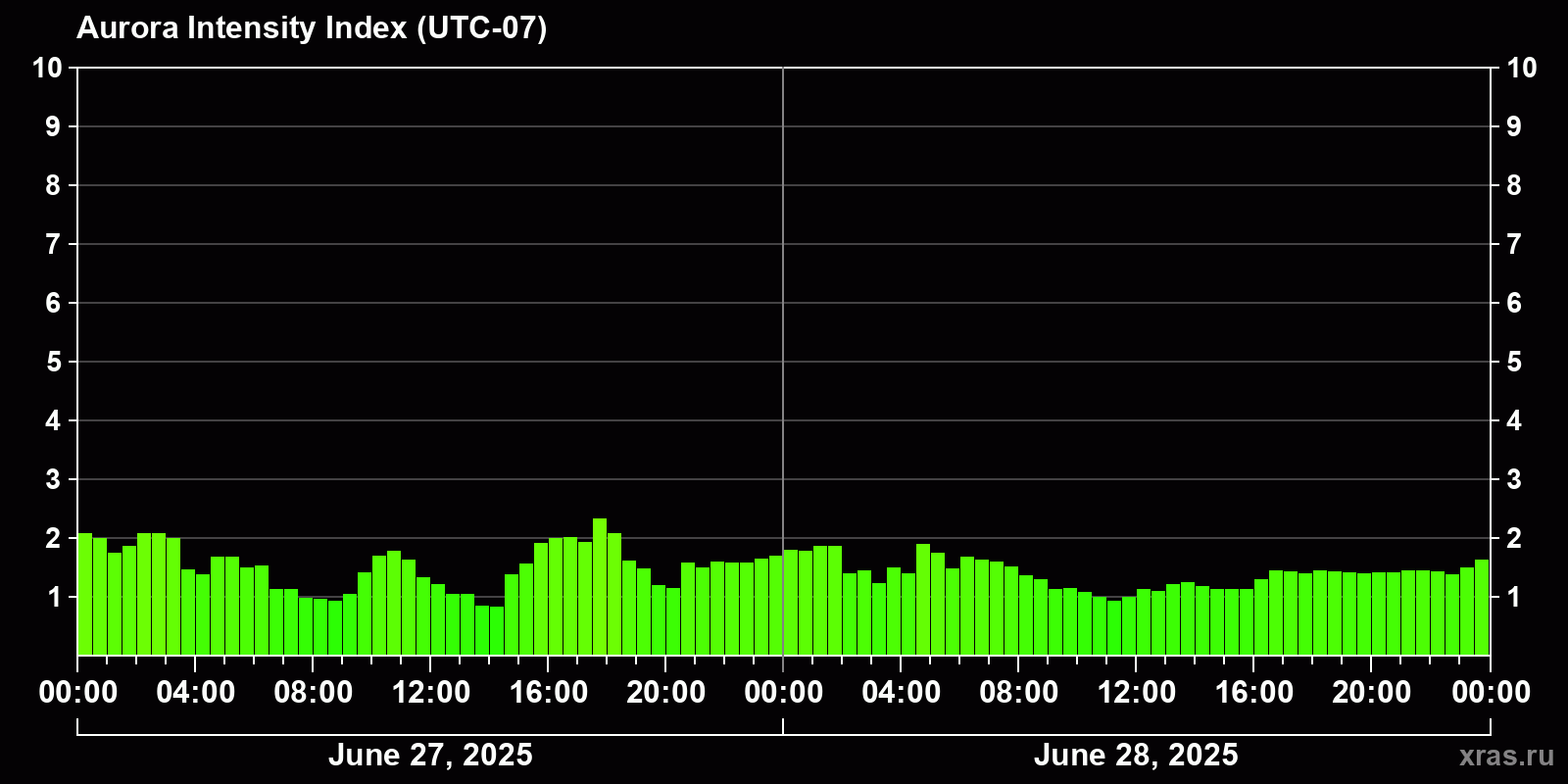 Auroral intensity index and the theoretically possible latitude of observations for nighttime in the Western Hemisphere as of 2025-06-28 23:54 (end of day) local time