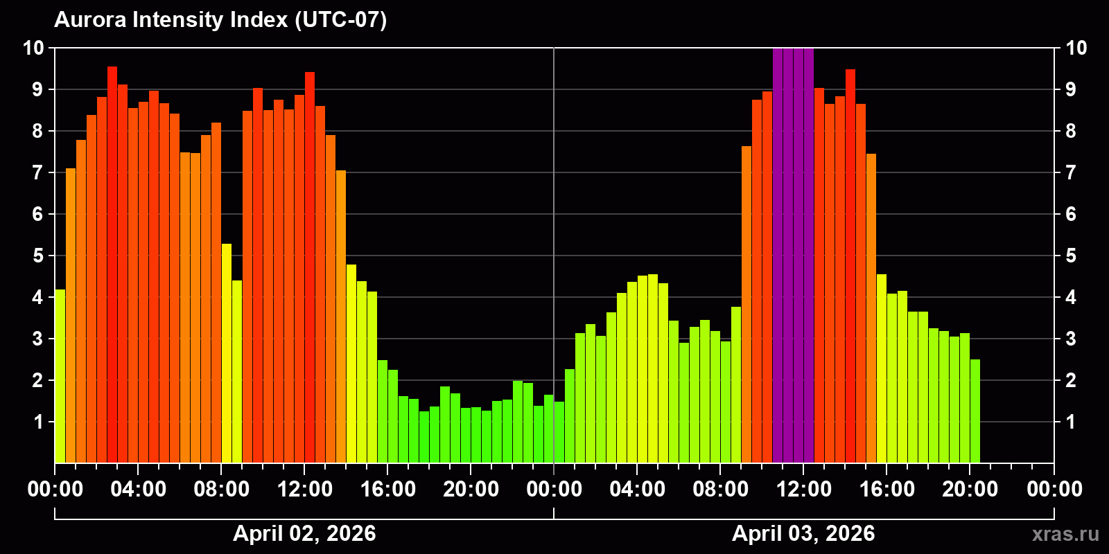 Auroral intensity index and the theoretically possible latitude of observations for nighttime in the Western Hemisphere as of 2026-04-03 18:25 (end of day) local time